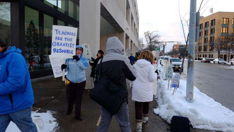 The teachers union organized the rally in response to Superintendent Terry Dade’s plan to lay off 218 district staff members, 152 of whom belong to the union. The Board of Education will vote on the cuts on Thursday, Dec. 19.